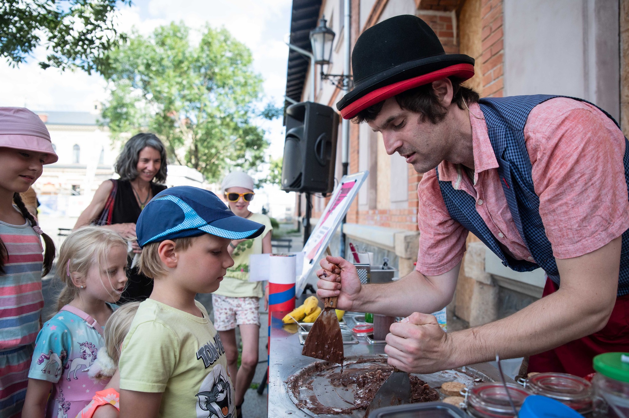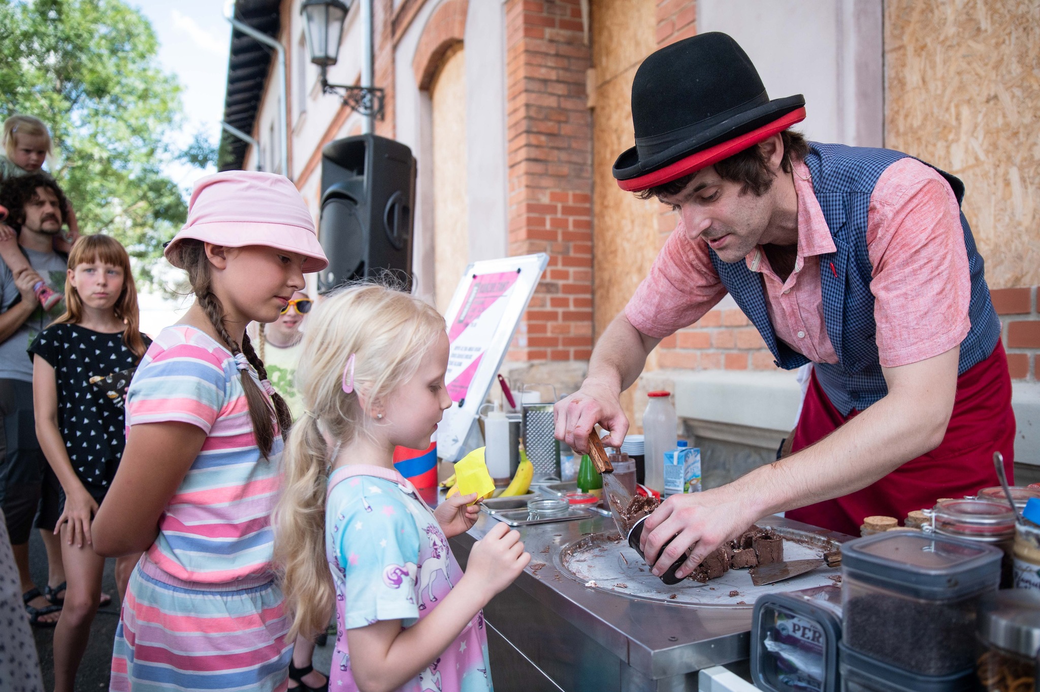 VIP Diváci jsou usazeni před zmrzlinovým strojem a přednostně se zapojují do interaktivní části představení .